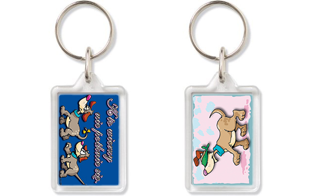 Brelok posiada dwie strony z kolorowym nadrukiem oraz metalowe kółko.