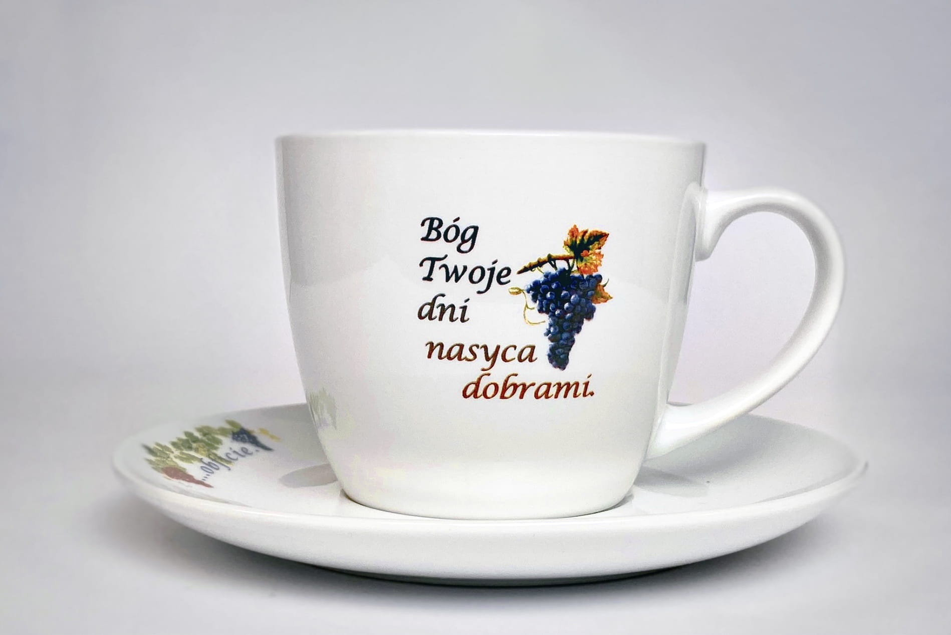 - filiżanka: "Bóg twoje dni nasyca dobrami..." + rysunek kiść winogron
