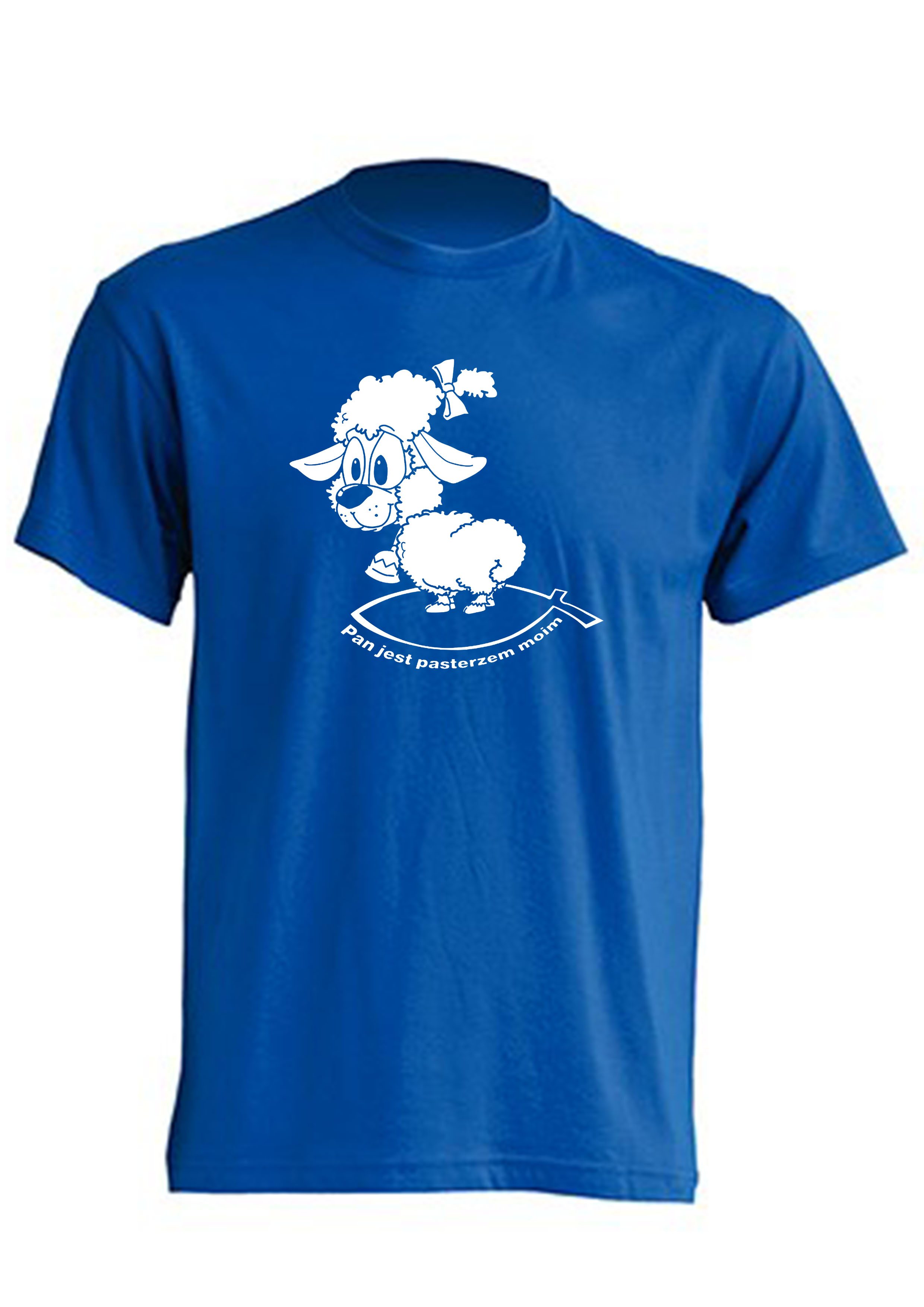Koszulka Nr. 4 w kolorze niebieskim z nadrukowanym napisem "Pan jest pasterzem moim".