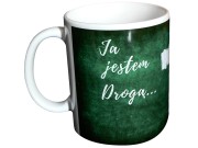 Kubek w kolorze białym z kolorowym nadrukiem (nadruk w kolorze zielonym).
