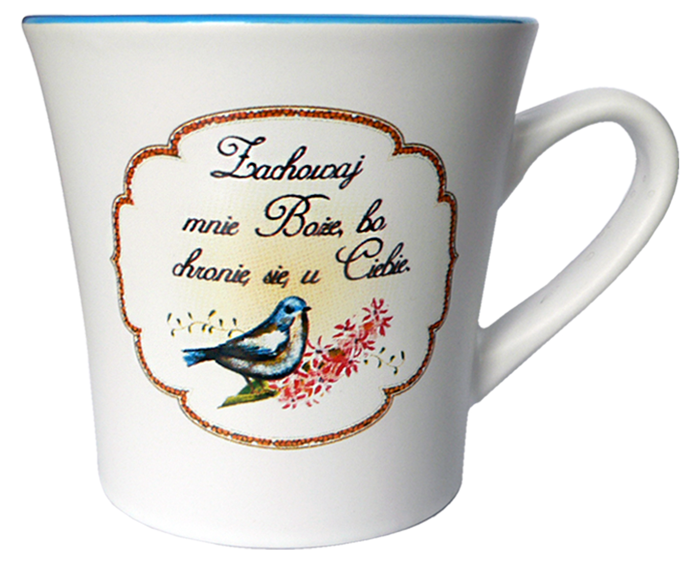 Kubek KD nr. 1 w kolorze białym z niebieskim wypełnieniem i nadrukiem Zachowaj mnie Boże.