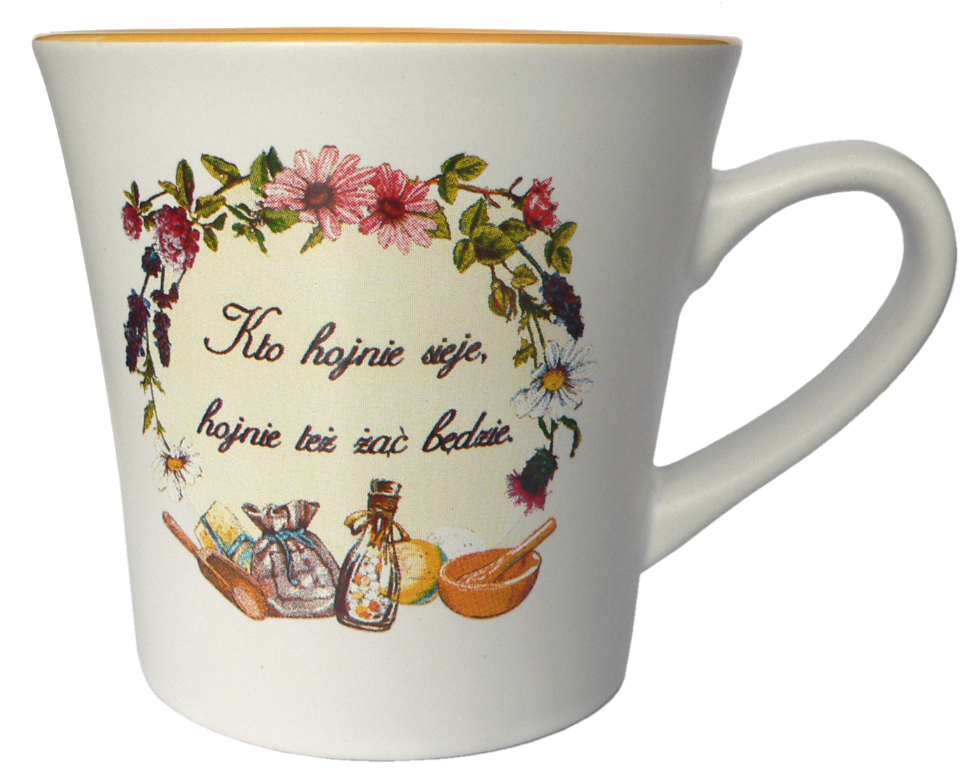 Kubek KD nr. 3 w kolorze białym z żółtym wypełnieniem i nadrukiem kto hojnie sieje.