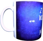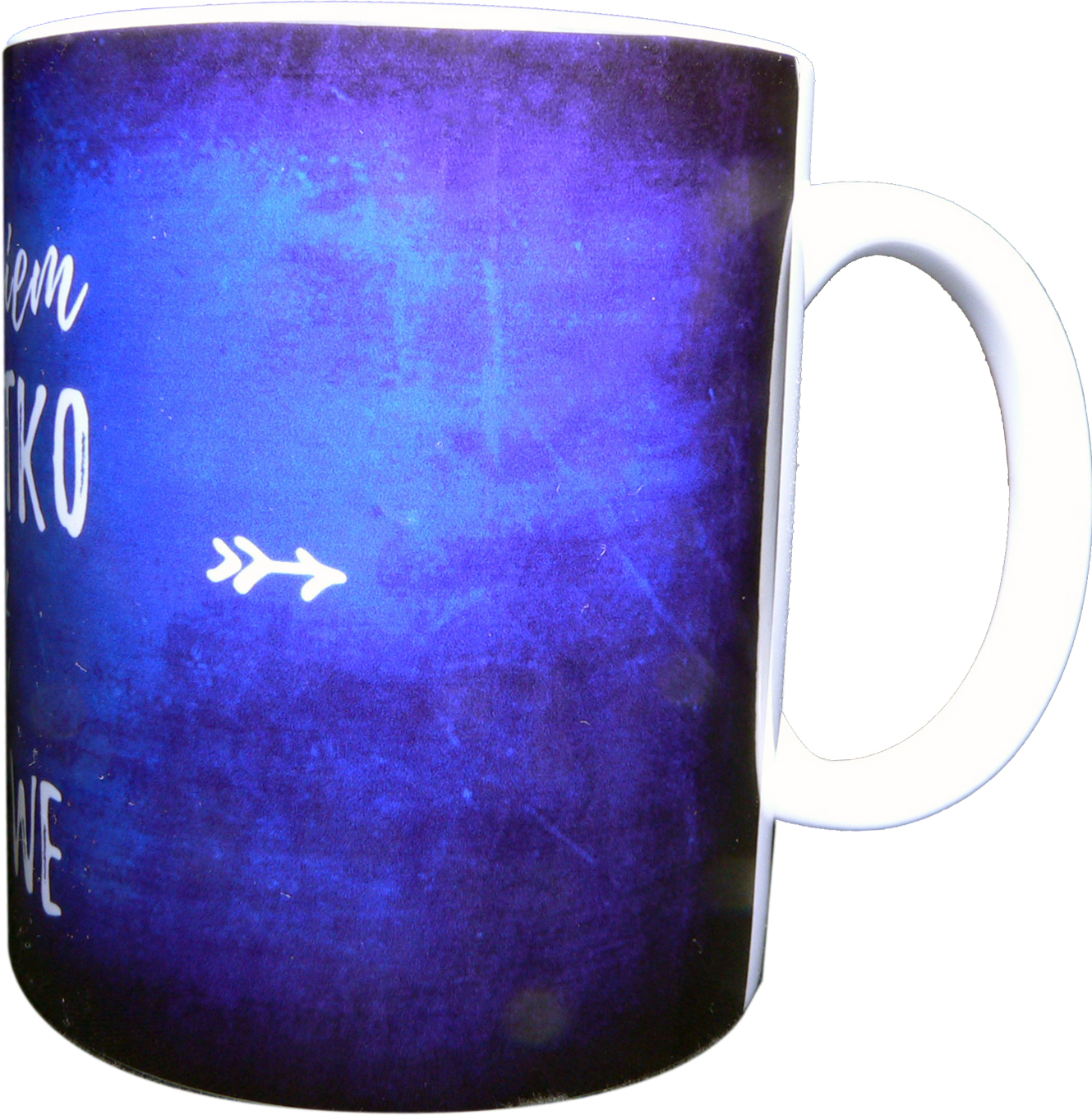 Kubek w kolorze białym z kolorowym nadrukiem (nadruk w kolorze granatowym).