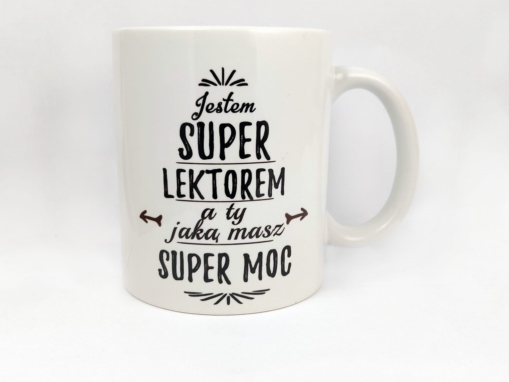 Napis: Ten sam napis z dwóch stron kubka: - Jestem super lektorem a ty jaką masz super moc.