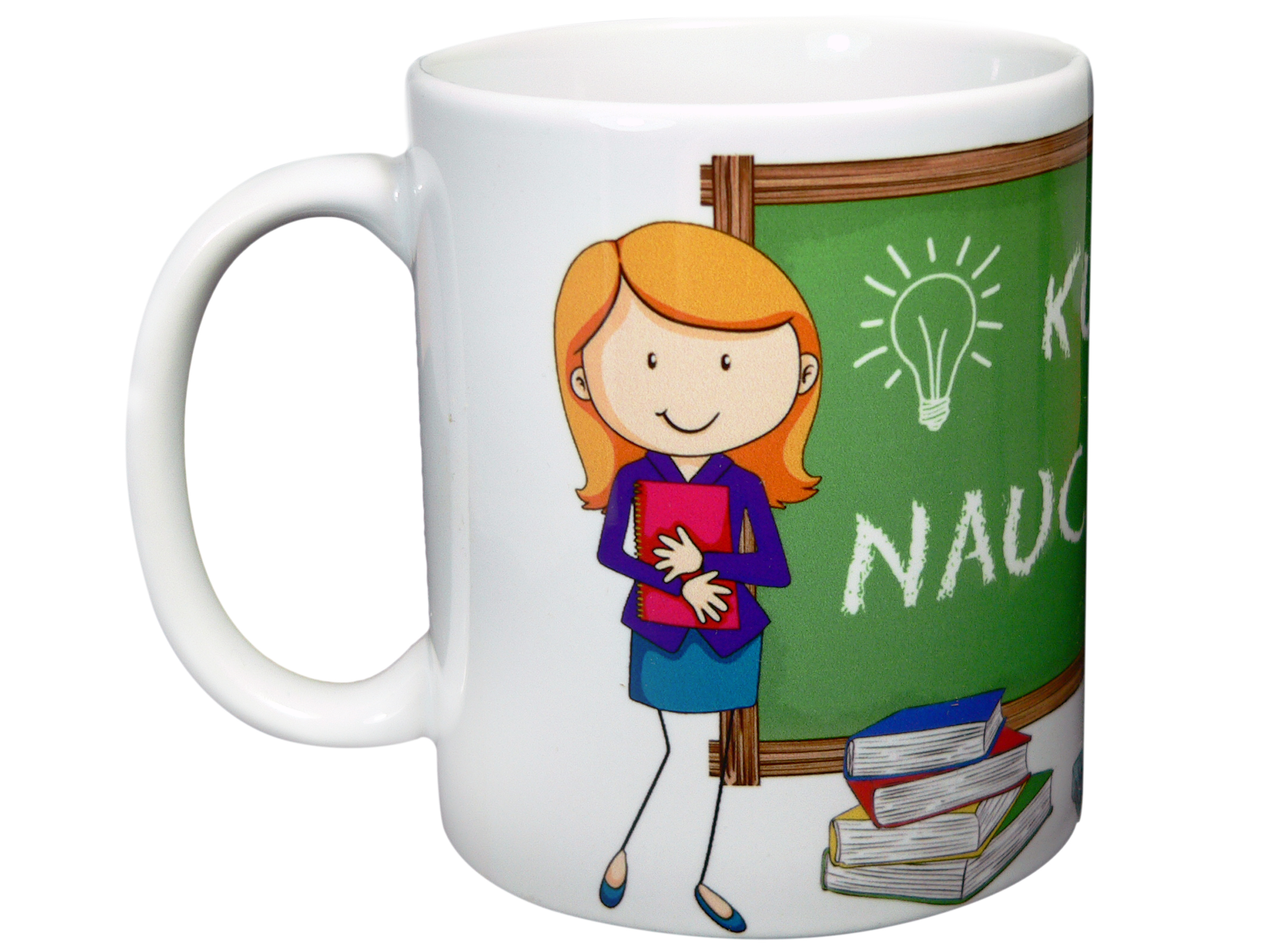"Kubek nauczyciela" w kolorze białym z kolorowym nadrukiem.