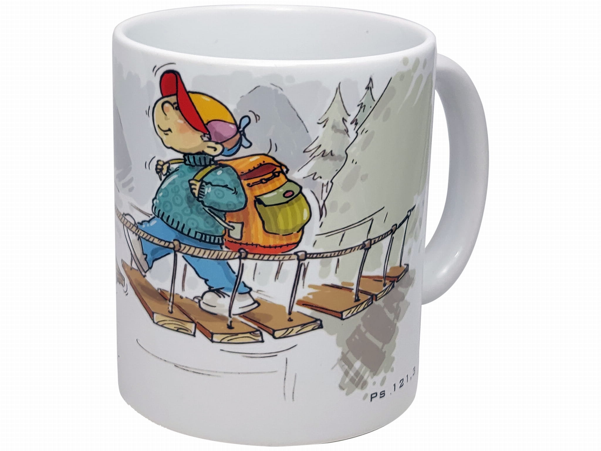 Kubek nr. 10 w kolorze białym z kolorowym nadrukiem.