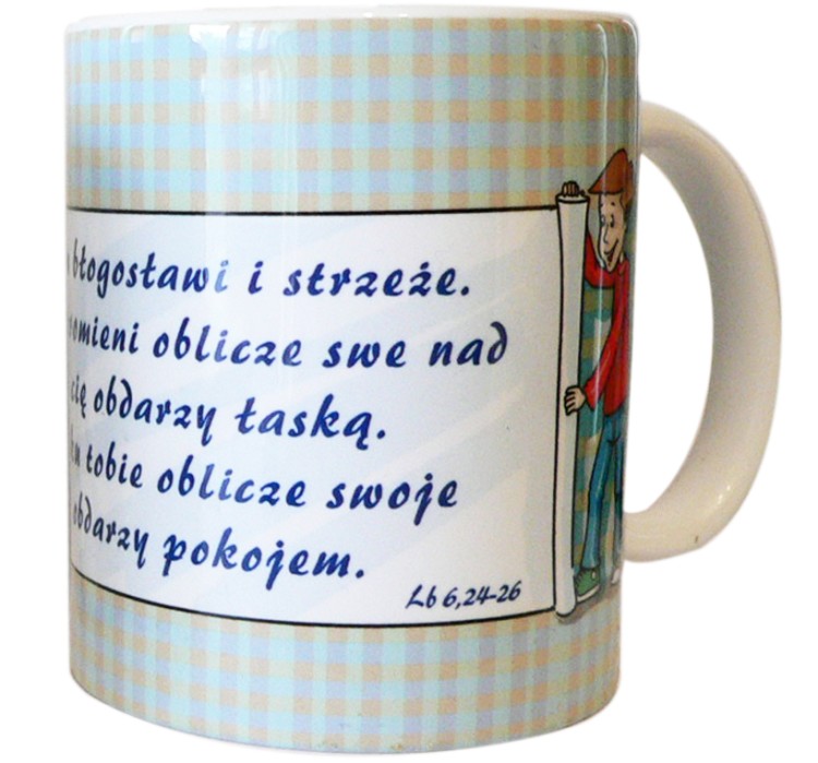 Kubek nr. 15 w kolorze białym z kolorowym nadrukiem.