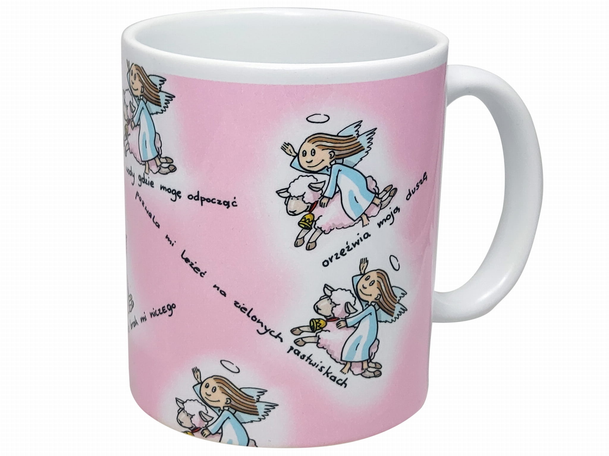 Kubek nr. 16 w kolorze białym z kolorowym nadrukiem.