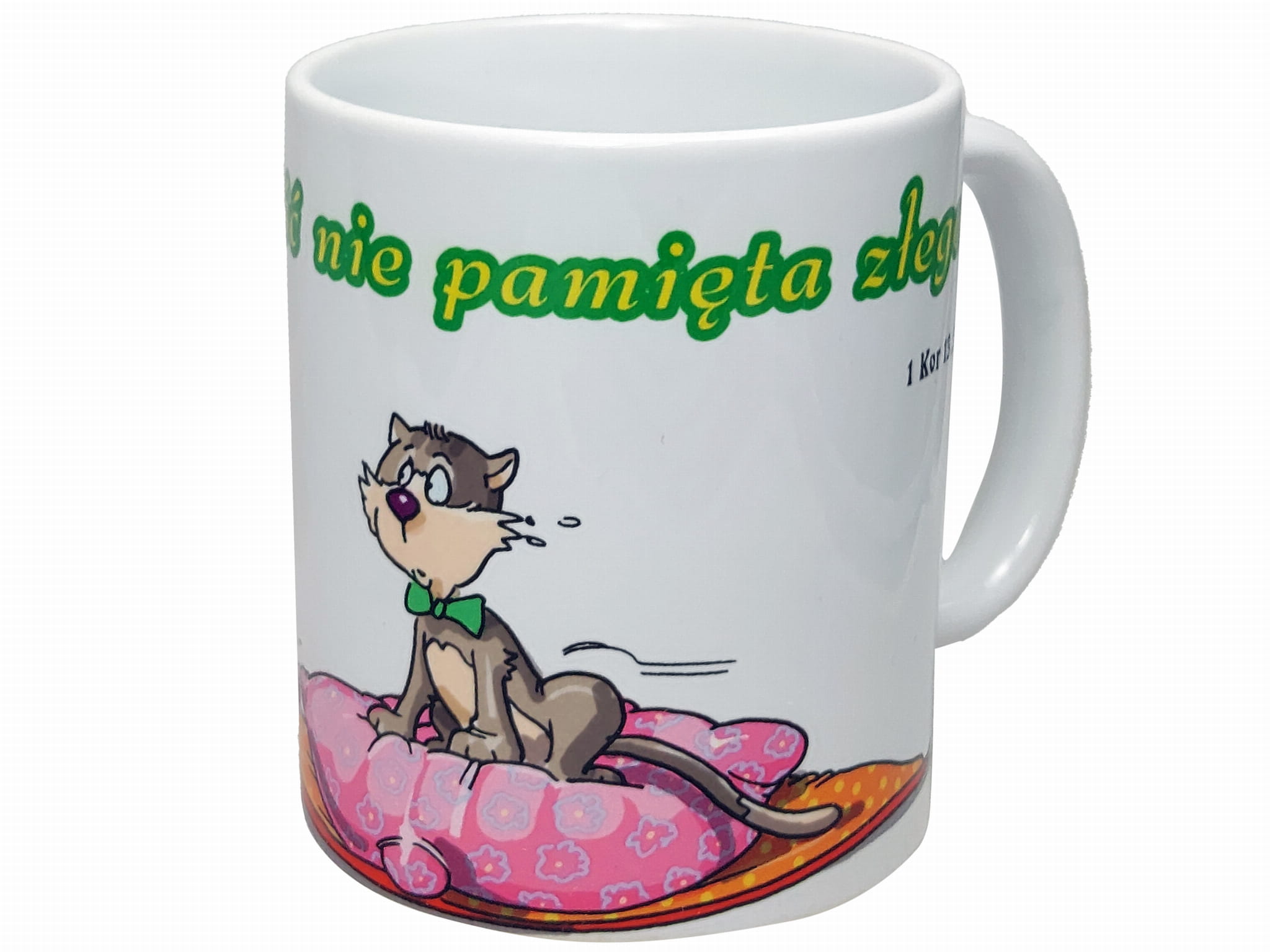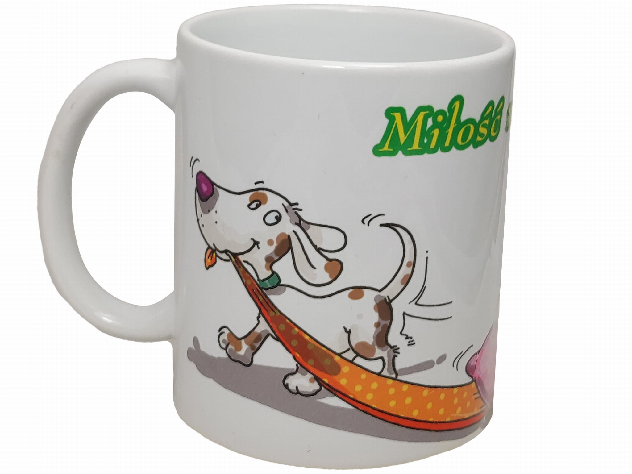 Kubek nr. 17 w kolorze białym z kolorowym nadrukiem.