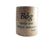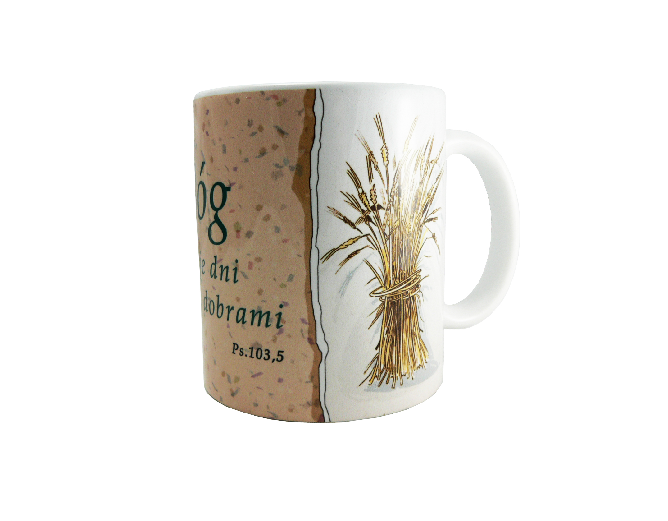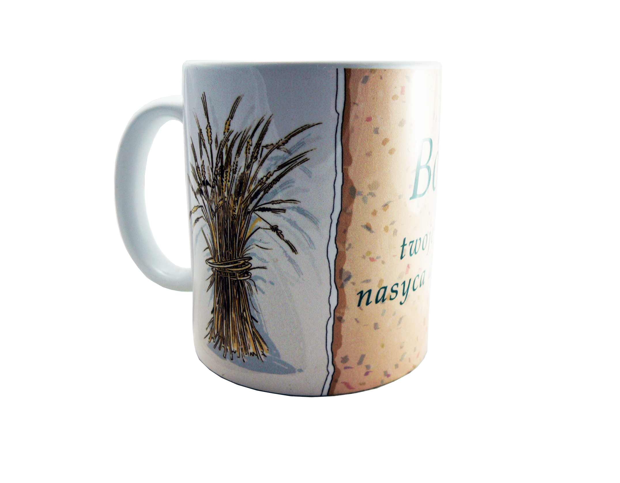 Kubek nr. 18 w kolorze białym z kolorowym nadrukiem.