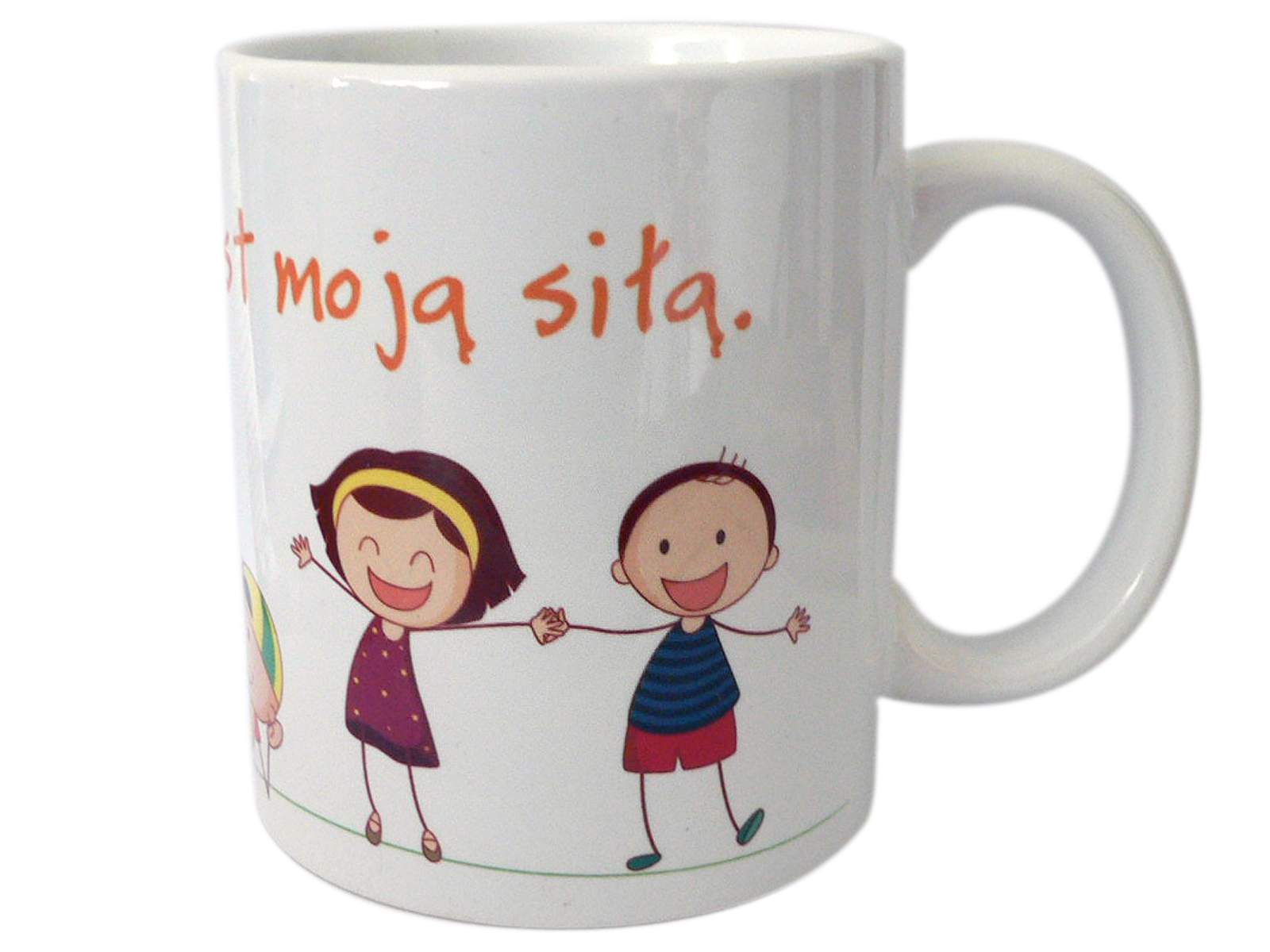 Kubek nr. 22 w kolorze białym z kolorowym nadrukiem.