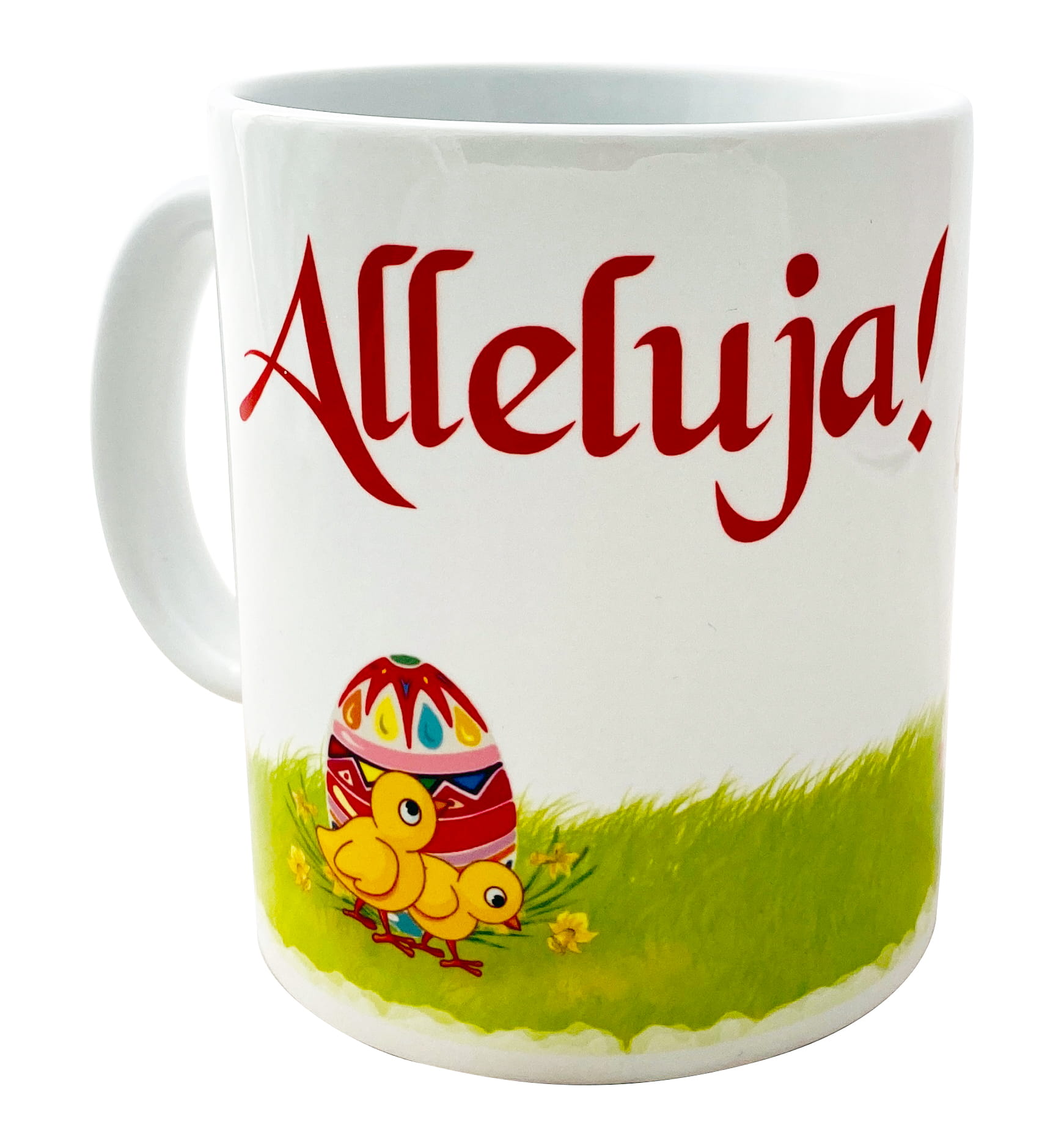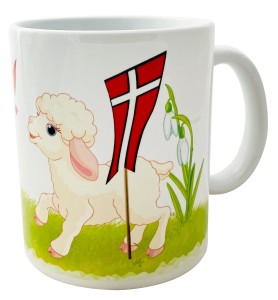 Kubek w kolorze białym z kolorowym nadrukiem.