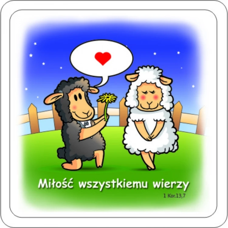 Na magnesie widnieje napis Miłość wszystkiemu wierzy 1 Kor 13,7.