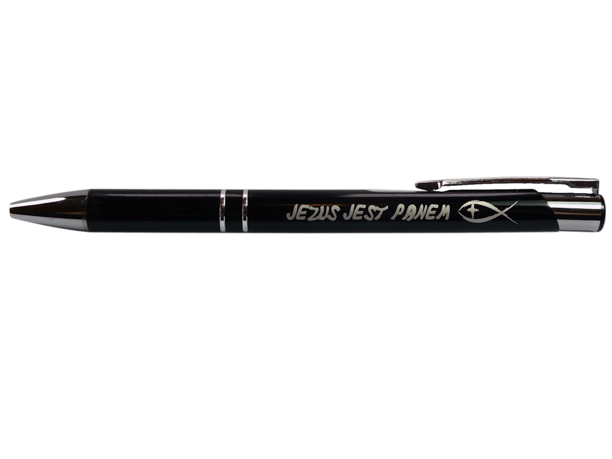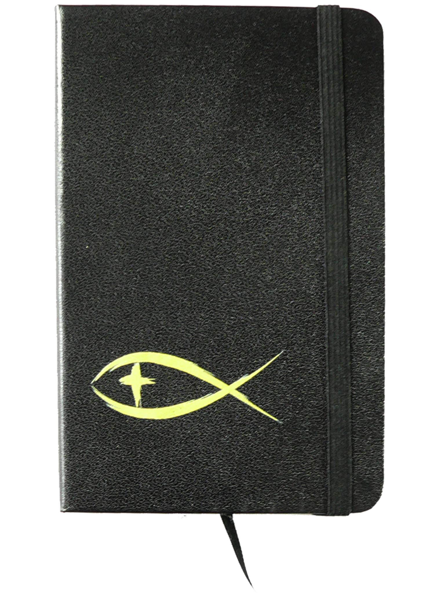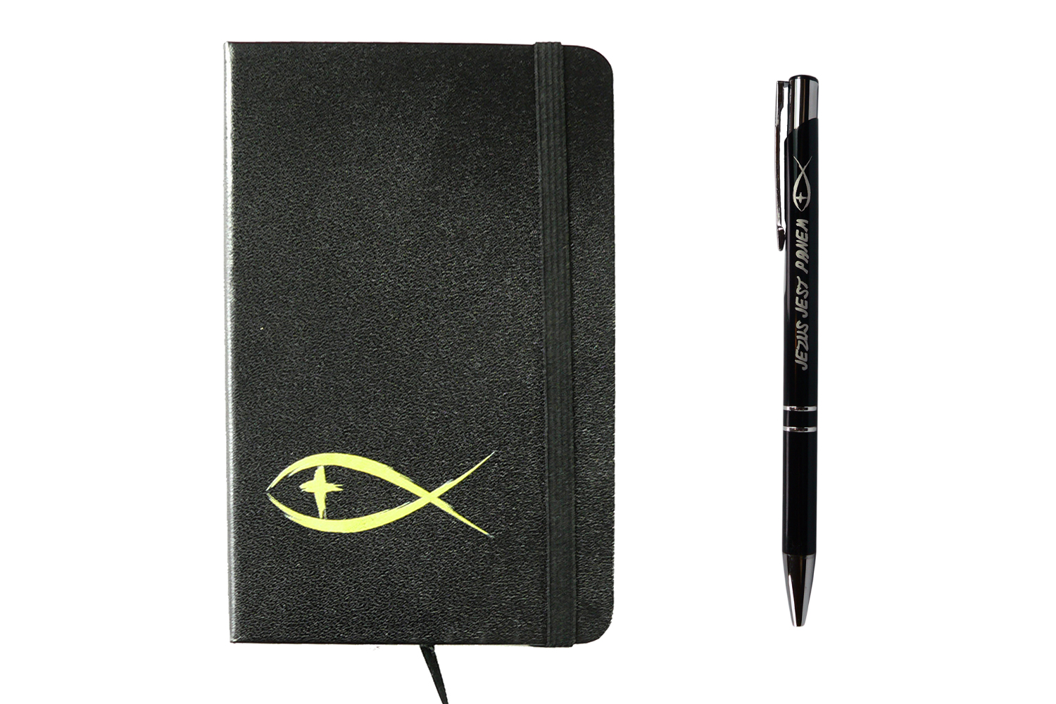 Zestaw prezentowy: notes z gumką oraz długopis z tym samym motywem graficznym i wersetem biblijnym.