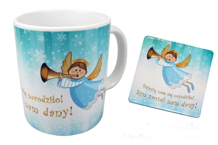 W skład zestawu wchodzi: kubek z napisem "Dziecię nam się narodziło, Syn został nam dany" (1 sztuka) oraz podstawka korkowa z tym samym motywem graficznym (1 sztuka).