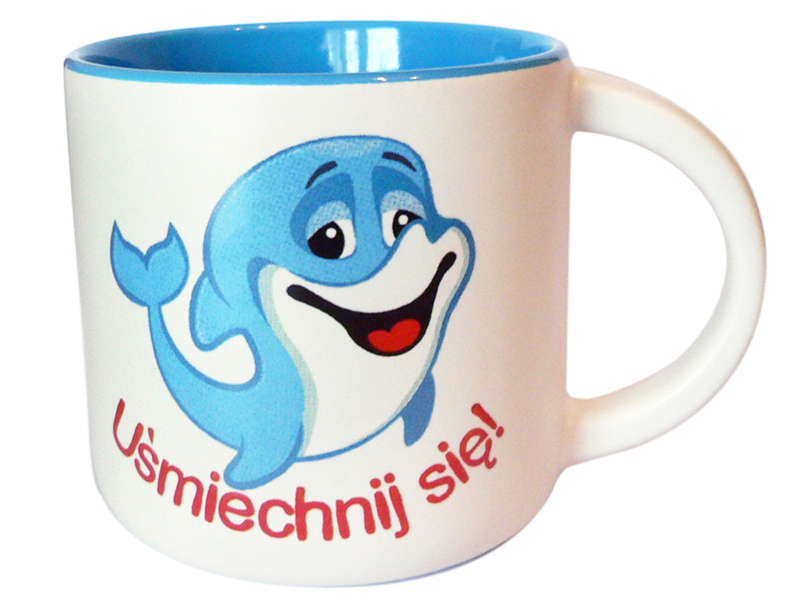 Kubek KR nr. 1 w kolorze białym z niebieskim wypełnieniem i nadrukiem delfina.