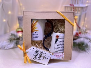 Zestaw zapakowany w tekturowe pudełko z okienkiem, przewiązany ozdobna rafią, wypełnienie pudełka wełna drewniana (zdjęcie poglądowe, kolor zdobienia może się różnić).