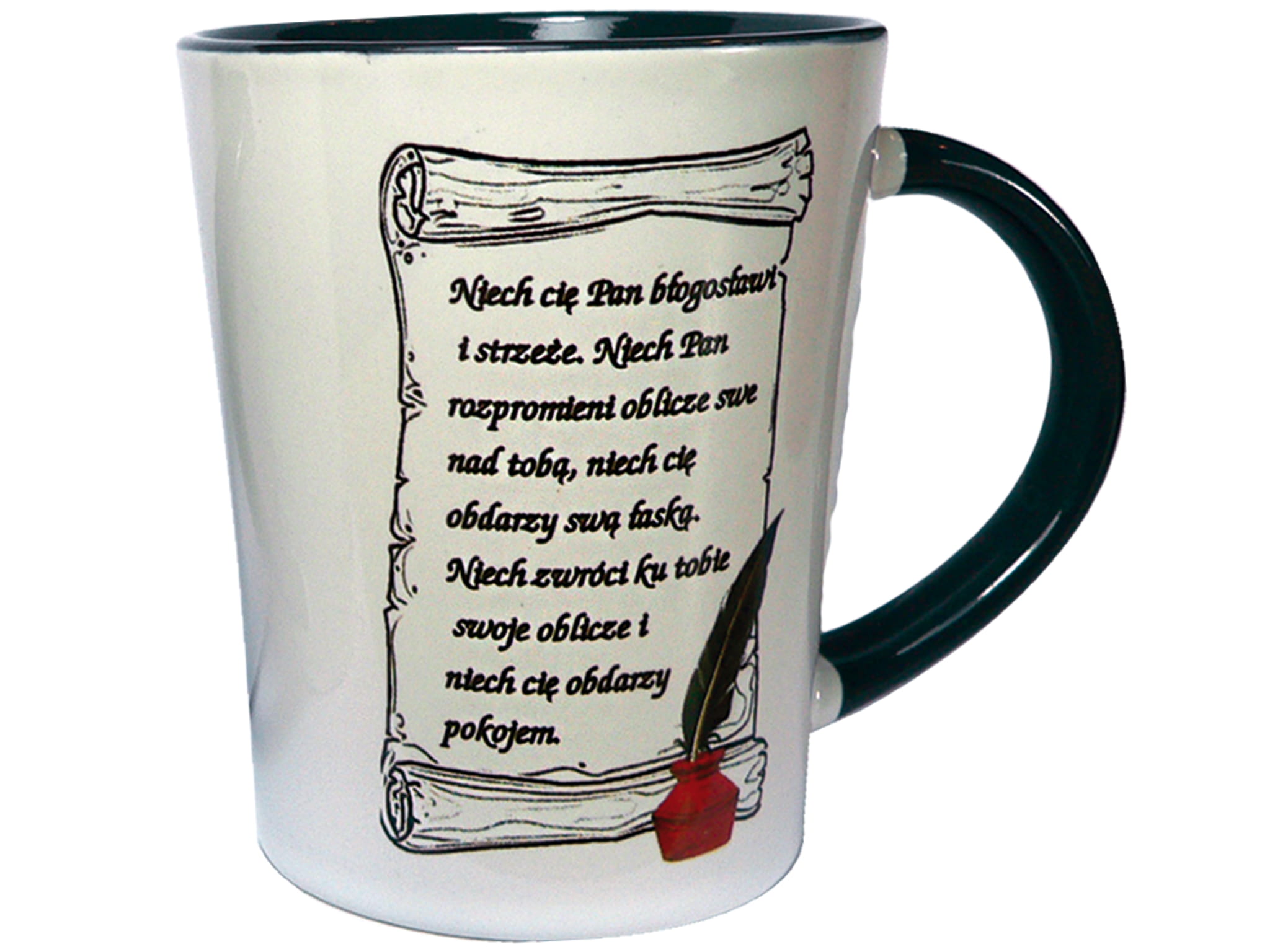 1. Kubek wysoki ceramiczny z napisem "Niech cie Pan błogosławi i strzeże. Niech Pan rozpromieni swe oblicze nad tobą, niech cię obdarzy łaską. Niech zwróci ku tobie swe oblicze i niech cie obdarzy łaską." Rysunek kałamarza.