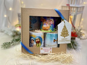 Zestaw w pudełku prezentowym: trzy kubki kolorowe o tematyce bożonarodzeniowej oraz trzy podstawki korkowe z tej samej serii.
