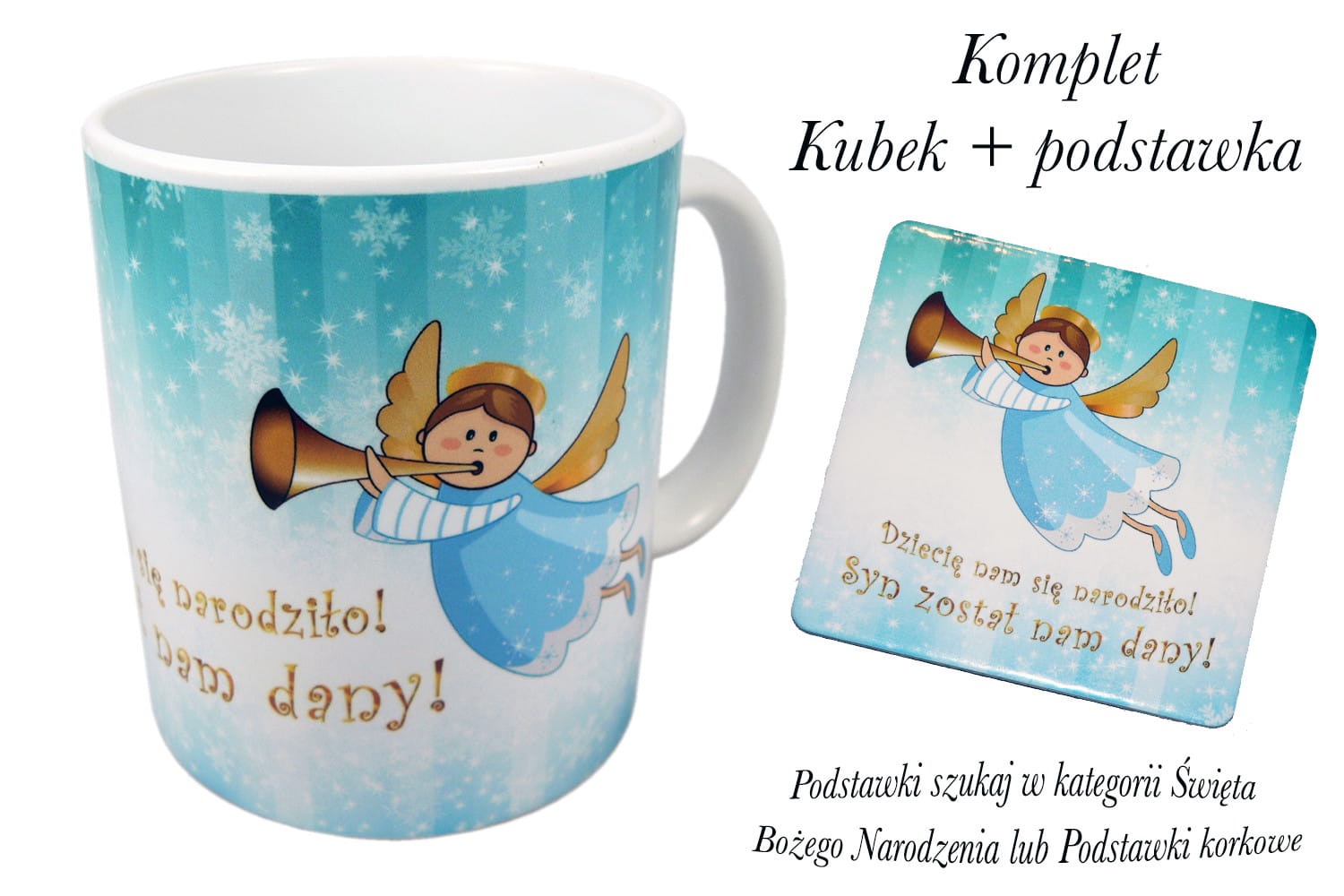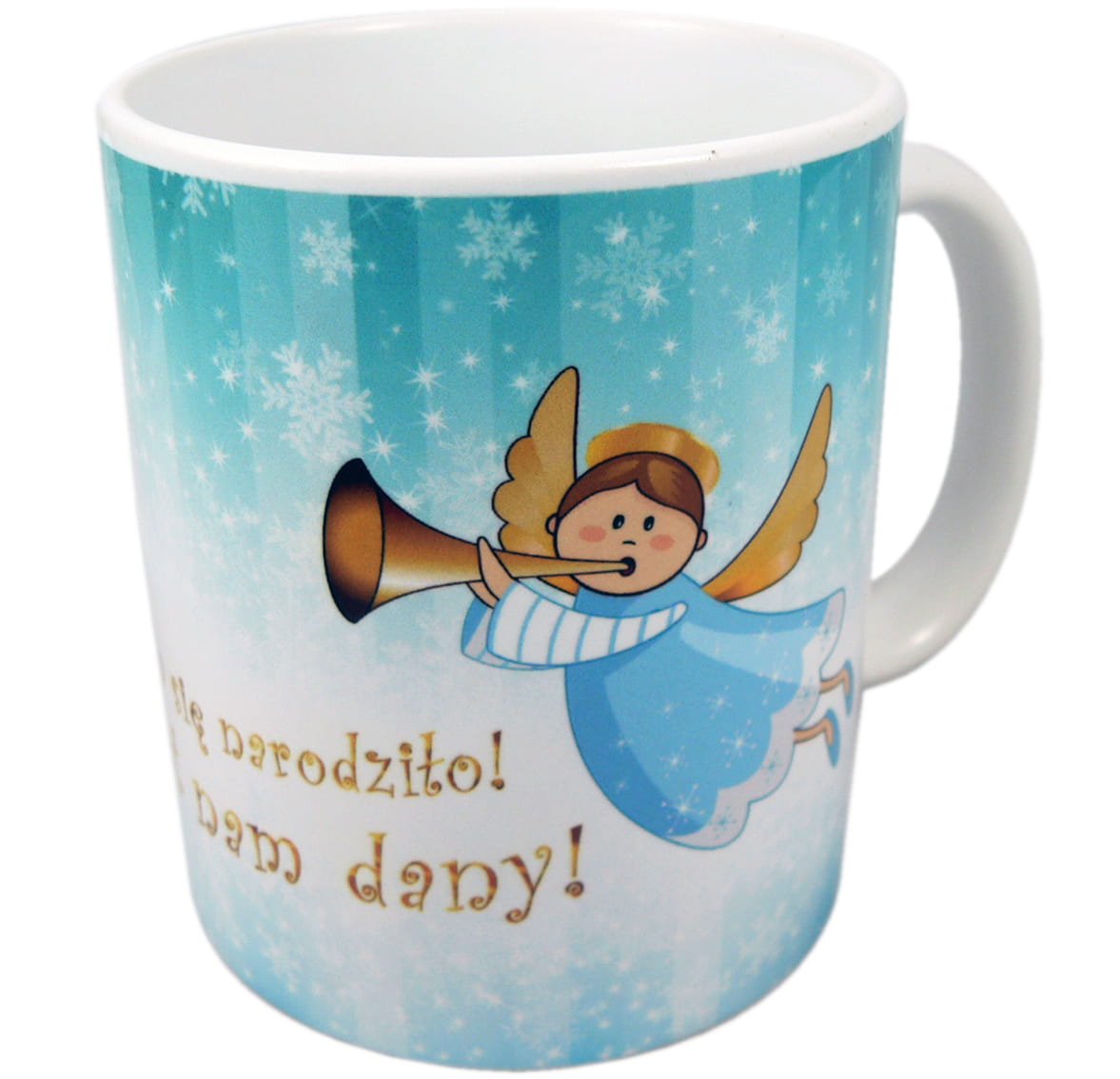 2. Kubek ceramiczny biały z kolorowym nadrukiem i napisem "Dziecię nam nie narodziło, Syn został nam dany!". Rysunek aniołów.