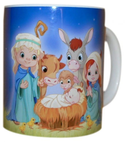 1. Kubek ceramiczny biały z kolorowym nadrukiem i napisem "Bóg się rodzi!".