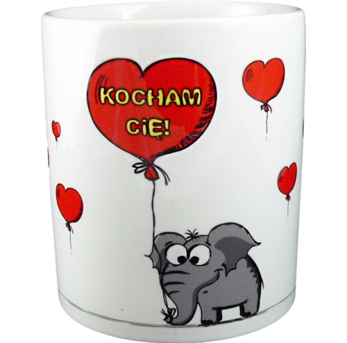 Kubek biały z kolorowym nadrukiem.